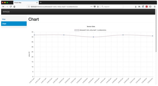Figure 13 shows the result of consulting the value of one of these sensors by clicking in the “More…” link shown in Figure 12. The chart label corresponds to the universal unique identifier (UUID) of the sensor. The values in the vertical axis correspond to the measurements obtained by the sensor. This simulated sensor reads voltage, so a “V” inside the parentheses is displayed. The values in the horizontal axis show the time at which the voltage reading is obtained, every 5 s. The data shown updates in near real-time.