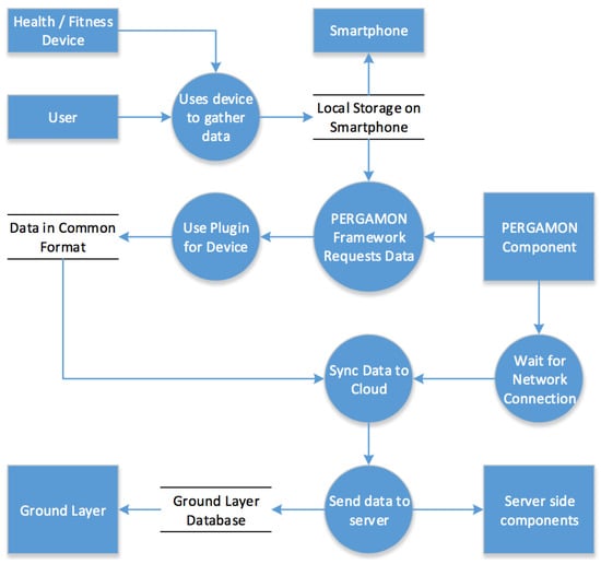 Devices are made compatible with the PERGAMON Sensor Network via a plugin system. Each device must be categorized into a device type, such as “Pedometer”, and all devices of that type must use a plugin to provide data to the server to store in the Ground Layer database in a common format. Each plugin written for the Sensor Network can have its own behaviour for obtaining the data from a device. Plugins simply operate via a common request and reply system where the custom behaviour required to interface with each device is contained purely within the plugin and hidden from other PERGAMON components. It is through this plugin architecture that the Sensor Network allows the PERGAMON framework to work with a large range of devices, as well as allowing devices to be easily supported in future. Once data is gathered from the devices connected to the Sensor Network, the data must be pushed up to the cloud once a network connection is available. Data will be held on the device and synchronised with the Ground Layer via a connection to the servers when possible, in order to allow the PERGAMON app to gather data while offline. Once the data is confirmed to be stored in the Ground Layer, the Sensor Network’s role in the PERGAMON framework is complete until more data is gathered.