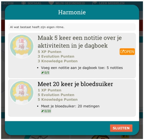 Figure 5). The difficulty of the goals will increase when the user advances in using the system. Goals can be mono-thematic (e.g., all about diet or physical activity) or multi-thematic (e.g., “A perfect healthy day”, that includes diet, physical activity, and therapy management).