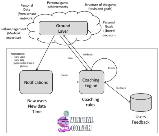 Figure 7 presents an overview of the virtual coach component. The data for the virtual coach comes from the Ground Layer. Data from the sensor network and data from the games can be accessed by the virtual coach component. Knowledge for the virtual coach is gathered from rules for self-management of T1D in cooperation with healthcare professionals. Personalization and tailoring of these self-management rules is done by defining personal goals between the client and the healthcare professionals (shared decision making). The Virtual Coach component consists of a coaching engine and a graphical representation of the virtual coach [
