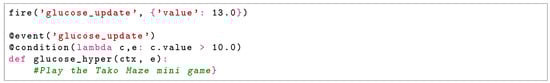 Figure 8. The rule (named ’glucose_hyper’ in this example) is executed based on an event (in this case the event ’glucose_update’), triggered by an event from the Ground Layer (in this case a trigger from the sensor network of a new measure of value 13.0). The rule is only executed when the value of the new measurement is greater than 10.0 (a blood glucose level of 10 or higher is called a hyperglycemia). Conditions can be general fixed values (such as hypoglycemia or hypoglycemia) or personals goals (such as the number of steps or the number of times a user wants to measure their blood glucose levels). The action of this coaching rule is a suggestion to play a mini game.
