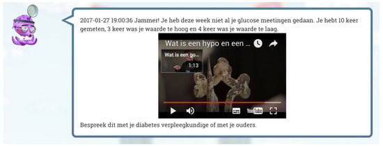 Virtual coach—Participants in both study groups were positive about the timing of messages and the number of reminders sent. Participants also provided positive feedback about the weekly overview messages given by the virtual coach, although they were not noticed by all participants. One participant from the pre-pilot study explained that receiving messages (or notifications) from the virtual coach helped to support their self-management. Participants in the pre-pilot group indicated that an overlay image of the virtual coach on their screen was annoying when they received a message from the coach. Therefore, the interface of the virtual coach was revised for the pilot study (i.e., messages were made clickable so that the whole message was visible at first instance) so that participants could be aware that more content was available than just the label text on the message box. Participants in both the pre-pilot and the pilot study said that educational movies presented by the virtual coach about diabetes were nice but became boring after multiple viewings. During both studies participants said that because of synchronization problems and requirements to enter data on a daily basis (and not after each measurement), feedback from the virtual coach was not up-to-date and therefore perceived as incorrect. More importantly, the coach was not developed to respond immediately to high or low glucose readings leading participants to suggest that it would be good if the virtual coach could send messages when measurements differed from normal values.