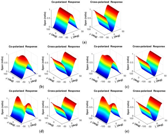 The polarization response signatures (PRS) of the CRs in the Etuoke Banner site are shown in Figure 1. There were more than five CRs in each image, and all of them were trihedral angle reflectors. We used three CRs to estimate the PDMs and one for verification. The PRS is widely used in PolCAL, and its main purpose is to check the correctness of the calibration. The PRS shows the normalized synthetic span value at different polarization patterns, which are expressed in a combination of ellipse orientation angel φ (degree) and ellipticity angle χ (degree). The co-polarized response is synthesized when the polarization of emission wave and receiving wave are the same, and the cross-polarized response is synthesized when they are orthogonal [28].