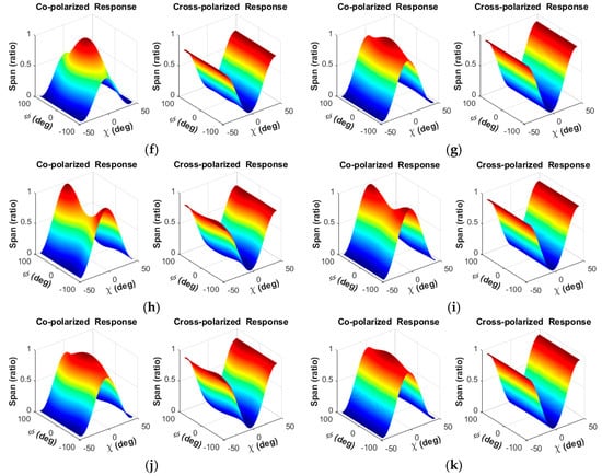 The co-pol and cross-pol response signature of CRs. The signatures show the normalized synthetic span value at different polarization pattern (expressed in a combination of ellipse orientation angel φ and ellipticity angle χ). These charts are: (a) theoretical PRS form of a triangular CR; (b,c) the PRSs before PolCAL and after PolCAL of image 0002441640; (d,e) the PRSs before PolCAL and after PolCAL of image 0002441191; (f,g) the PRSs before PolCAL and after PolCAL of image 0002463755; (h,i) the PRSs before PolCAL and after PolCAL of image 0002475549; (j,k) the PRSs before PolCAL and after PolCAL of image 0002491702. There are two PRS pictures for each image: the left one is the PRSs before calibration, and the right one is the PRSs after calibration.