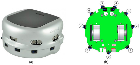 The mobile robot platform [23]: (a) Khepera III robot; (b) a bottom view of the robot showing the locations of the infrared sensor.