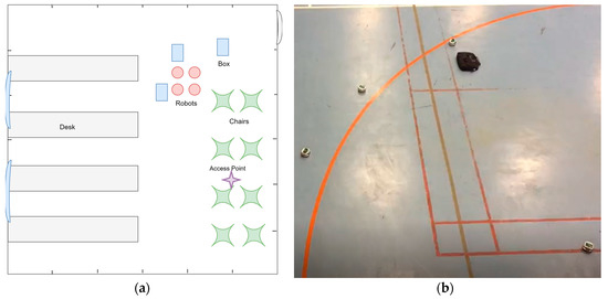 Samples of the environments used for experimental testing: (a) a sketch of a heavily obstructed small office space (training/meeting room); (b) a snapshot of a lightly obstructed large open space (gymnasium).