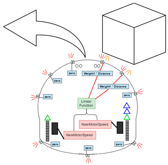 For obstacle avoidance, a simple and efficient algorithm was designed and implemented in each robot based on both Braitenberg’s concept in vehicles [25] and the virtual force field mechanism [26]. A Braitenberg vehicle is an agent that can autonomously move around based on its sensor inputs. It has primitive sensors that measure some stimulus at a point and wheels (each driven by its own motor) that function as actuators or effectors. In the simplest configuration, a sensor is directly connected to an effector so that a sensed signal immediately produces the movement of the wheel. Thus, the motion of the vehicle is directly controlled by sensors, yet it results in a behavior that may appear complex or even intelligent. The Braitenberg concept is mostly suitable when there is a separate motor to each wheel on the robot, which is the case in robot platform used.