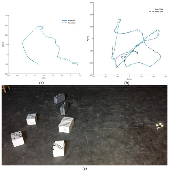 Validating the accuracy and robustness of the implemented robot self-localization system: (a) a short and simple navigation path; (b) a long and complicated navigation path; (c) a snapshot of the testing environment under the VICON system.