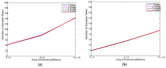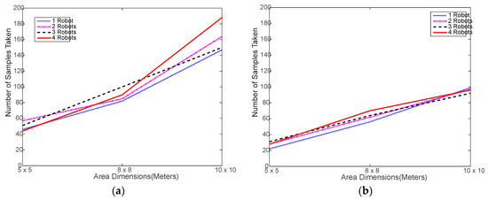 Figure 9 shows that the number of samples obtained via simulation are almost identical, regardless of the number of robots used. As far as the comparison with experimental testing as in Figure 5, it is obvious that the number of samples varies with the area size in a very similar manner. This is a good indication that the simulated random search process is correctly implemented.