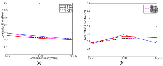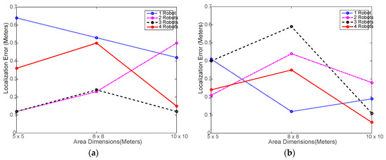 Figure 10 shows again that using multiple robots has no impact on the localization accuracy and that the actual localization accuracy for the set of parameters used is indeed lower than 0.3 m in all cases, which is close to the average error obtained in experimental testing as in Figure 6.
