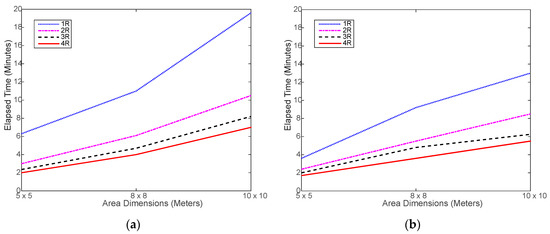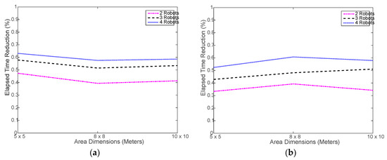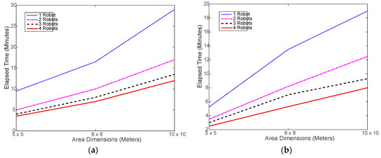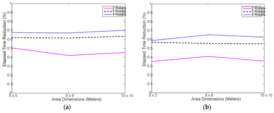 Enhanced simulated elapsed time after allowing the robot swarm to only cover 95% of the cells: (a) for distributed WiMAP algorithm; (b) for distributed DWiMAP.