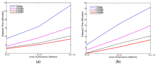 Experimental testing requires intensive labor and time to perform large-scale experiments. In addition, each experiment has to be repeated a sufficient number of times before any conclusion can be drawn out of it. Therefore, a simulation testbed was implemented using MATLAB software platform [36]. In order to verify that the simulation testbed can precisely simulate the experimental environment, all experimental testing scenarios were mimicked using the simulation testbed for comparison purposes. To this end, the exact values of all parameters used in the experimental testing, such as the area dimensions, the random search distance thresholds, and the coverage area, along with the mechanical parameters of the robot platform, such as the average robot speed and detection ranges of the infrared and ultrasonic sensors, were used in the simulation testbed. Each experiment was repeated 50 times, each with a different random generator seed. The reported results reflect the averages of each set of 50 trials.