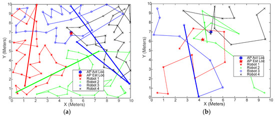 Robot navigation path showing the problem of the high overhead caused by the random search algorithm: (a) for distributed WiMAP algorithm; (b) for distributed DWiMAP.