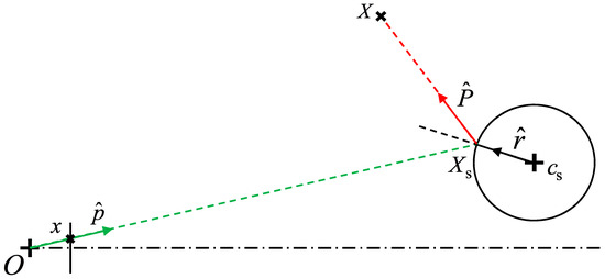 The “−” solution must be selected since the physical correct solution is determined by the closest point with respect to the origin. The direction of the projection ray can be directly determined by considering that the radius passing by Xs must be the bisector of the angle between and (Reflection Law). Thus, the sum gives a vector aligned with the radius and having a modulus equal to the double of the projection of , i.e., . Hence, it holds: