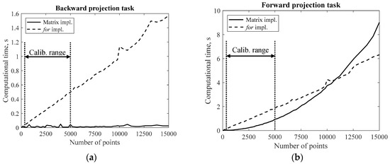 The previous paragraph describes how forward and backward projection can be analytically solved in a closed-form for a single point. If large data are considered, i.e., a large number of points, a for-loop can be carried out by sequentially perform the computation on the various points singularly. Anyway, matrix formulation can speed up several operations, depending on the implementation and on the number of points. The present section describes the main steps required to implement the described models in order to process arrays of points. The performances of the for-loop were finally compared to the performances of the proposed matrix implementation for both BP and FP tasks with an increasing number of points to be projected.