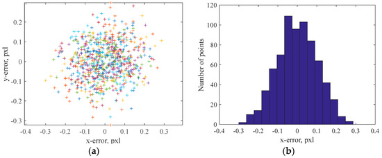 Re-projection errors after the optimization process: (a) 2D overview and (b) x-error histogram.