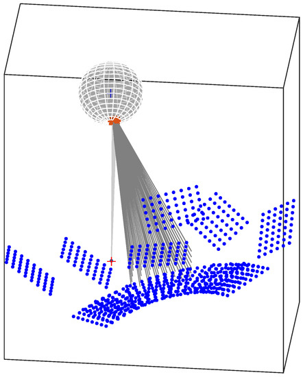 The optimization results are also reported in Figure 7, which shows the distances between detected and re-projected grid corners for all the acquired images (Figure 7a) and the x-errors histogram (Figure 7b). The obtained maximum distance is about 0.32 pixel, while the mean distance (computed on 720 points) is 0.13 pixel. Figure 7 shows a Gaussian distribution of the error. This hypothesis has been verified through the Royton’s test [22], providing a p-value of 0.769 (with a significance of 0.05), which confirmed a Gaussian distribution of the experimental data. Finally, Figure 8 shows the poses of the acquired grids as obtained by the optimization procedure. The red-cross in the figure represents the camera central point, the sphere represents the mirror (with the proper scaling of positioning and radius) while the blue dots represent the grid-corners. The reflection rays for one of the grids were also represented, with a grey line, to show an example of the BP process.