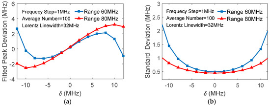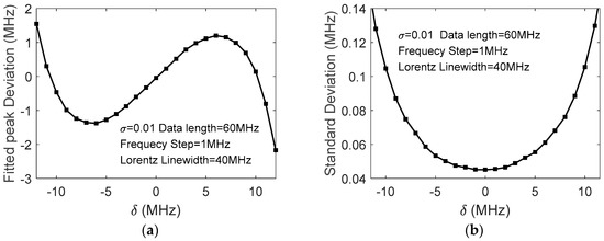 Figure 10. Processing results of experimental data: (a) Deviation of fitted peak frequency from Brillouin peak vs data range’s center deviation; (b) Standard deviation of fitted peak frequencies vs data range’s center deviation.