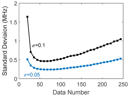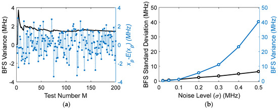 The BFS variances obtained by quadratic fitting are simulated with different noise levels. Figure 2a shows an example of BFS variance versus test numbers with σ = 0.1 , d = 1   MHz , x N = 200   MHz , and Lorentzian peak set at the middle of the data range; the blue points are the peak frequencies for different simulation tests, and the black line is the variances obtained by averaging over the test numbers. Obviously, the fitted peaks are randomly distributed due to the noise. Figure 2b gives the variances and standard deviations versus the noise level σ. It is seen that the standard deviation is a straight line, showing that the BFS variance is inversely proportional to the square of SNRA, coincident with Equation (4).
