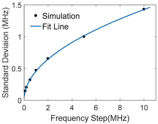 The relation between BFS variance and frequency step is also studied by simulation with σ = 0.1 and x N = 60 MHz . Figure 3 shows that the BFS standard deviation is the square root of the frequency step, coincident with Equation (4); therefore, a smaller step will lead to higher accuracy of the BFS measurement. However, the frequency step d is generally inversely proportional to the probe pulse width ΔT of OTDR system, determined by FFT for the optimal spatial resolution. A trade-off has to be taken between BFS accuracy and spatial resolution.