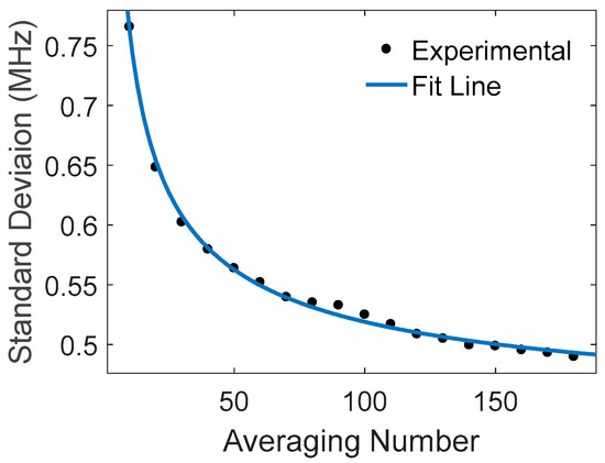 The SNR can be enhanced directly by averaging M multiple traces, as S N R ~ M 1 / 2 . Figure 6 gives the standard deviation of the fitted peak frequency versus the averaging number M, showing behavior of σ ν ~ 1 / M 1 / 2 , consistent with Equation (6).