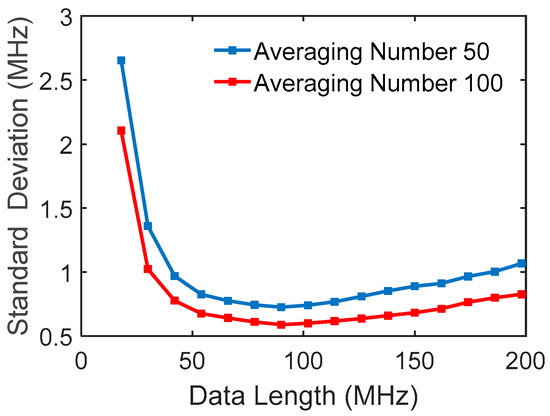 The data length used in the fitting is an important parameter which affects the variance of the fitting peak frequency. Figure 9 shows the standard deviation of the fitted peak varied with the data length, where multiple trace signals are used for data processing, and the two curves are for the different averaging numbers. The experimental data were obtained from the returned wave at a fiber distance of 30 km. The data range is centered at the Brillouin peak obtained by averaging 10,000 traces, giving the expected Brillouin peak. They resemble well the simulated curves in Figure 5.