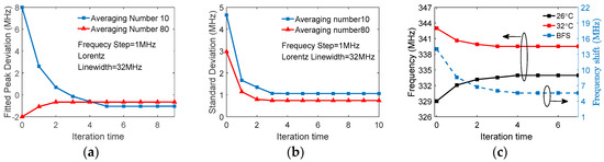 Compared with the conventional fitting method, the iteration method requires fewer averaging numbers for the same accuracy. In our system (Matlab 2016b, 4 CORE I7-4770S, 8 G RAM) the data acquisition and FFT for each trace need 0.03 s, whereas a single quadratic fitting takes only 0.000017 s, which can be negligible. For example, it takes 80 × 0.03 s = 2.4 s and 10 × 0.03 s = 0.3 s, respectively, to get the two curves of Figure 11a. Obviously, the iteration method will improve system speed. The same accuracy of the BFS by the iterative quadratic fitting is demonstrated experimentally in the BOTDR temperature sensor, as shown in Figure 11c. A section of FUT was intentionally heated and the detected signals are averaged over 200 traces with a 1 MHz frequency step. The extracted frequencies converge at 333.9 MHz for a temperature of 26 °C and at 339.5 MHz for 32 °C after three iterations. The obtained BFS of 5.6 MHz is almost the same as that obtained with Lorentzian fitting provided by Matlab (5.5 MHz).