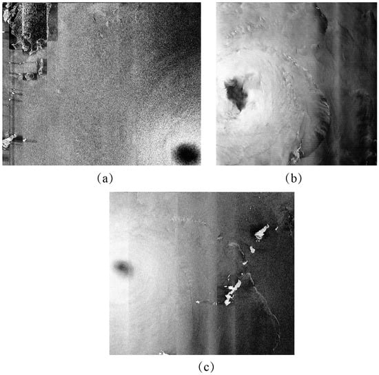 VH-polarization GF-3 SAR images taken during three typhoons. (a) The image from typhoon Noru acquired in Global Observation (GLO) mode on 2 August 2017 at 21:09 UTC. (b) The image from typhoon Doksuri acquired in Wide ScanSAR (WSC) mode on 13 September 2017 at 22:14 UTC. (c) The image from typhoon Talim acquired in GLO mode on 14 September 2017 at 21:29 UTC.
