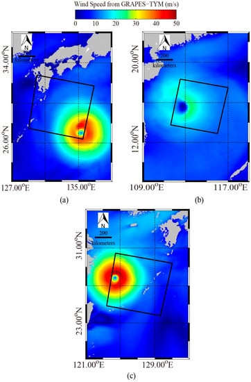 Global and Regional Assimilation and Prediction System—Typhoon model (GRAPES-TYM) wind maps, in which rectangles represent the coverage of the corresponding three VH-polarization GF-3 SAR images in Figure 1. (a) GRAPES-TYM wind maps from typhoon Noru on 2 August 2017 at 21:00 UTC. (b) GRAPES-TYM wind maps from typhoon Doksuri on 13 September 2017 at 22:00 UTC. (c) GRAPES-TYM winds maps from typhoon Talim on 14 September 2017 at 21:00 UTC.