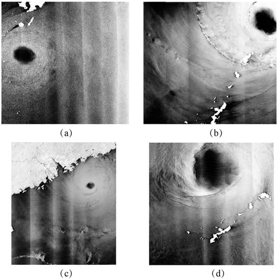 Three VH-polarization GF-3 SAR images taken during the period of three typhoons. (a) The image from typhoon Noru acquired in GLO mode on 4 August 2017 at 09:12 UTC. (b) The image from typhoon Noru acquired in WSC mode on 4 August 2017 at 21:26 UTC. (c) The image from typhoon Hato acquired in WSC mode on 22 August 2017 at 22:23 UTC. (d) The image from typhoon Talim acquired in WSC mode on 16 September 2017 at 09:34 UTC.