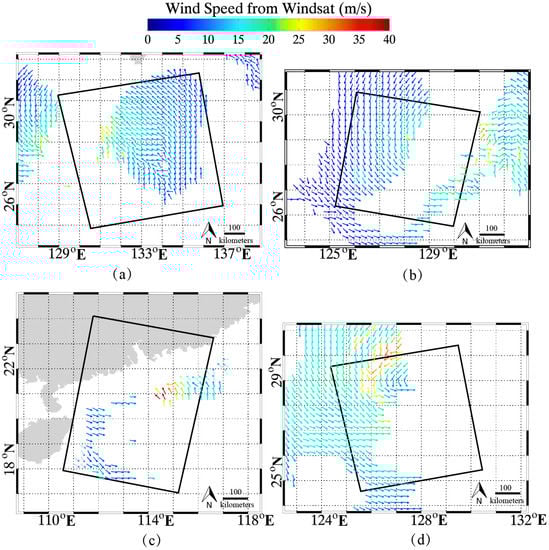 Windsat wind maps corresponding to the four VH-polarization GF-3 SAR images in Figure 2, in which rectangles represent the coverage of the images. (a) Windsat wind map from typhoon Noru on 4 August 2017 at 09:18 UTC. (b) Windsat wind map from typhoon Noru on 4 August 2017 at 21:18 UTC. (c) Windsat wind map from typhoon Hato on 22 August 2017 at 22:30 UTC. (d) The Windsat wind map from typhoon Talim on 16 September 2017 at 09:36 UTC.