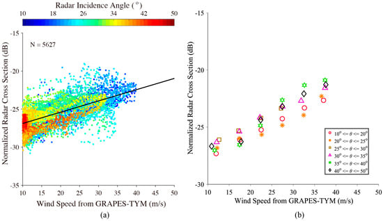 In order to make a reasonable analysis, sub-scenes with winds smaller than 10 m/s and non-homogeneous sub-scenes due to heavy rainfall, where the ratio of image variance and squared image mean value was greater than 1.05 [37,38], were excluded in this study. Figure 5a shows the NRCS of VH-polarization GF-3 SAR versus wind speeds from GRAPES-TYM, in which the color represents the radar incidence angle. Figure 5b shows the average NRCS of VH-polarization Gaofen-3 SAR versus wind speeds between 10 m/s and 40 m/s for a 5 m/s bin at various incidence angle ranges. In general, it is found that the NRCS of VH-polarization GF-3 SAR linearly enhances with the growth of wind speed. This finding is consistent with the conclusions of several previous studies [18,20,31]. It is also shown that the slop between NRCS of VH-polarization GF-3 SAR is almost unique for various radar incidence angles at moderate to strong winds. The range of the reference GRAPES-TYM wind speed is up to 40 m/s and no indication of the signal saturation problem was encountered in the application of traditional wind retrieval algorithms for co-polarization C-band SAR. The black line in Figure 5a represents the linear fitting result between VH-polarization GF-3 NRCS and wind speed.