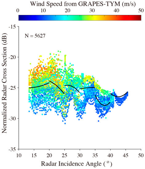 Figure 6 shows the NRCS of the entire VH-polarization GF-3 SAR image versus collocated radar incidence angle, in which the color represents the wind speed. A fluctuating relationship can be observed between the NRCS of VH-polarization GF-3 SAR and the radar incidence angle, which is similar to the analyzed results in [26]. The black lines in Figure 6 also represent the fitting results between the VH-polarization GF-3 NRCS and the radar incidence angle.