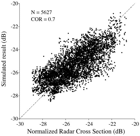 We collected many matchups from the three VH-polarization GF-3 SAR images from the typhoons. As mentioned above, the matchups with wind speeds smaller than 10 m/s are excluded in the tuning process in order to give reasonable fitted results using the least-squares method. Figure 7 shows that the correlation (COR) between the observed NRCS and the simulated values is 0.7, indicating the proposed empirical algorithm is suitable for typhoon wind retrieval.