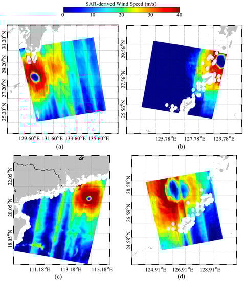 Figure 8 shows the retrieved wind maps corresponding to the four GF-3 images in Figure 3. It is necessary to establish that retrieved winds with wind speeds smaller than 10 m/s are not reliable. Although the Windsat wind speed is up to 40 m/s, the retrieved winds do not encounter the saturation problem as found in the application of C-band co-polarization GMFs. Discontinuities exist in the retrieved winds maps because the GF-3 SAR image acquired in GLO and WSC mode is comprised of several radar beams. In particular, the retrieved TE of typhoon Lester shown in Figure 8d is distorted, because of the instrumental noise of the radar beam. For this reason, the retrieved wind speed is significantly different around the edge of each radar beam than in other regions.