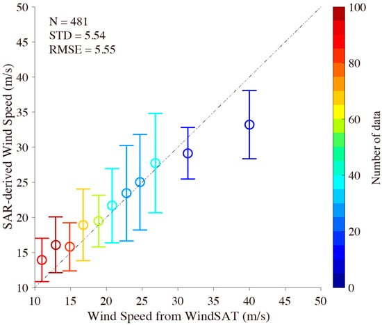 Comparison between SAR-derived wind speeds and measurements from Windsat grid winds between 10 m/s and 40 m/s for a 2 m/s bin, in which error bar represents the standard deviation (STD) of wind speed at each bin.