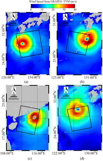 GRAPES-TYM wind maps, in which the rectangles represent the coverage of the corresponding three VH-polarization GF-3 SAR images in Figure 3. (a) GRAPES-TYM wind maps of typhoon e on 4 August 2017 at 09:00 UTC. (b) GRAPES-TYM wind maps of typhoon Noru on 4 August 2017 at 21:00 UTC. (c) GRAPES-TYM wind maps of typhoon Hato on 22 August 2017 at 22:00 UTC. (d) GRAPES-TYM wind maps of typhoon Talim on 16 September 2017 at 09:00 UTC.
