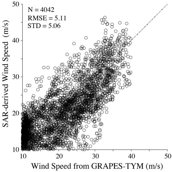 The comparison between SAR-derived winds and GRAPES-TYM winds is shown in Figure 11. It is found that the RMSE of wind speed is 5.1 m/s, which is less than the statistical analysis exhibited in Figure 8. This is not surprising as unique wind data were used for tuning and validating the proposed empirical algorithm. However, it is an obvious conclusion that the proposed algorithm works for typhoon winds retrieval from VH-polarization GF-3 SAR images without encountering the signal saturation problem when the wind speed is up to 40 m/s. Therefore, cross-polarization GF-3 SAR is an effective method for monitoring strong winds in typhoon conditions.