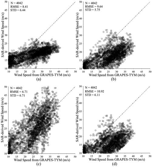 Comparison between SAR-derived wind speeds using the existing three algorithms and GRAPES-TYM winds. (a) using the algorithm proposed in [20]. (b) using the algorithm proposed in [22]. (c) using the algorithm proposed in [23]. (d) using the algorithm proposed in [25].