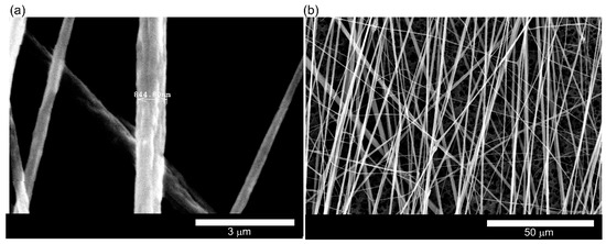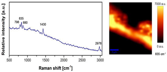 Confocal Raman Microscopy high-resolution imaging technique for characterization of PVDF NFs’ structural properties was implemented. This technique is efficient, as it provides spectroscopic data, which cannot be achieved by IR or XRD [20]. Our setup was equipped with 633 nm wavelength laser, the magnification of 50x to observe Raman shifts at 500–3000 cm−1, silicon was used for calibration and our collected spectra data was filtered/smoothened. The results from Raman spectroscopy are illustrated in Figure 3. Thus, a demonstration that our electrospinning process parameter leads to β-phase transformation and enhancement [20].