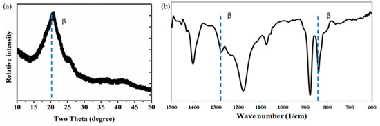(a) XRD and (b) FTIR patterns are collected for PVDF nanofibers with a diameter of 800 nm. The peaks reveal characterization of α and β-phases of the nanofibers [13].