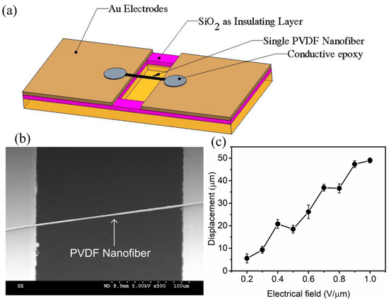 (a) Fabricated substrate; (b) schematic diagram of the device for measuring the piezoelectric coefficient of a single nanofiber. Insert shows a suspended PVDF nanofiber with a diameter of 800 nm and length of 400 µm; (c) shows the displacement of the center of fiber as a function [20].