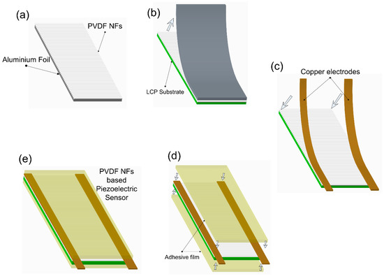 After mechanical and piezoelectric characterization of single nano fiber, we developed a sufficient and stretchable sensor by using a PVDF nano fiber sensor. The fabrication process in developing the sensor is shown in Figure 5. First, aligned PVDF nanofibers were collected on an aluminum foil substrate. Later on, the fibers were carefully transferred to a flexible liquid crystal polymer (LCP) with 25 µm thickness 10 mm width and 25 mm length. Copper electrode with dimensions 2 mm width and 10 mm length were fixed on two ends of the sensors. The whole sensor was then laminated for the protection of the nanofibers. We used LCP as the substrate for PVDF nanofibers due to its outstanding mechanical properties. Mechanically, LCP has a tensile modulus ranging from 10 to 24 GPa, tensile strength from 125 to 255 MPa and very low moisture absorption (0.02%) and permeability. Chemically, LCP is extremely inert to a wide range of chemicals, including acids and solvents. LCP is fire resistant and produces relatively non-toxic combustion by-products.