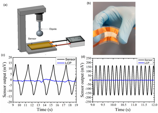 Since the primary purpose of designing this sensor is to use it for human motion detection, it is critical to ensure the sensors function at very low frequencies (below 2 Hz) in which most of the human motion occurs. A vibrating sphere (Dipole) was used to evaluate the performance of the proposed sensor under dynamic pressure by generating an oscillatory pressure and then the sensor output is observed under various frequencies. The detail of the vibrating sphere oscillator system is described elsewhere [12,21]. Dipole is kept at a distance of 2 mm above the sensor and amplitude of vibration is kept constant (250 mVrms), while the frequency changed from 0.5 Hz to 5 Hz. Figure 6a shows the schematic of the experiment. The object that generates the stimulus is a stainless sphere (vibrating sphere) of 8 mm diameter, which is attached to a minishaker (model 410, B & K, Norcross, GA, USA) through a rod of 2 mm diameter. The minishaker was driven by a sinusoidal signal generated by a function generator amplified through a power amplifier (Type 2718, B & K). Data of peak to peak amplitudes of the sensor outputs were recorded using LABVIEW software (version, National Instruments, Austin, TX, USA) as the temperature increases. During the experiments, sensors were directly connected to a data-acquisition card without using any external electrical filters or amplifiers. The experiment was repeated on four different sensors to ensure the repeatability of the results. Figure 6c,d show the sensor output as a function of time for frequency of 0.5 Hz and 5 Hz, respectively. In order to ensure that the voltage generated is actually from PVDF nanofibers and not a result of coupling with dipole, a device made of LCP with the same electrode set-up but with no nanofibers (marked as LCP in Figure 6) was tested under the same experimental conditions as that of the nanofiber sensor. From Figure 6, it is clear that the device without sensing element shows no clear output, indicating no experimental error or coupling in the system.
