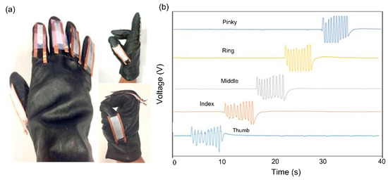 Flexible PVDF electrospun strain sensors for human-motion detection (a) photograph of five individual sensors mounted on a smart glove. The states of bending and stretching the glove fingers are also shown; (b) sensor output as a function of time for five independent strain sensors when each sensor move at frequency of about 1 Hz.