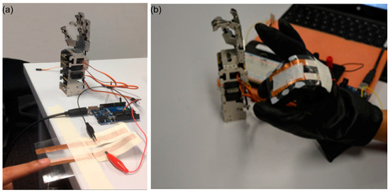 (a) experimental setup of using one PVDF electrospun strain sensor connected to a robotic finger; (b) experimental setup of mounting five sensors on a glove to detect finger motion and transfer it to the robotic arm (video of experiment is available in the Supplementary Materials).