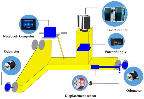 In contrast, the mobile three-dimensional laser scanning system is more suitable for the scanning of a tunnel due to its high efficiency and accuracy. In the mobile three-dimensional laser scanning system, the differential global positioning system (DGPS) and inertial measurement unit (IMU) are often used as the integrated navigation module, and when combined with imaging sensors, they can acquire three-dimensional point clouds [5,6,7]. However, the tunnel is a closed space, lacks global positioning system (GPS) signals and has poor lighting, and many traditional mobile laser scanning systems are unsuitable for this special environment. Therefore, scholars at home and abroad have carried out studies on the three-dimensional laser scanning system of tunnels, which generally can optimally integrate various sensors and measurement instruments to directly obtain the tunnel cross-section for analysis. Mobile tunnel scanning systems have already been developed at home and abroad, most of which are measured in a tunnel with a three-dimensional laser scanner or a cross-section profiler on a track inspection trolley. These include the GPR3000 track inspection trolley with a cross-section profiler100 and the GPR5000 track inspection trolley with a Leica HDS4500 laser scanner, which were researched and developed by the Amberg Company in Switzerland [8]. These systems integrate a displacement sensor, clinometer sensor, odometer and prism in addition to the measurement device and can obtain the tunnel point cloud with absolute coordinates. In addition, the SiTrack One mobile track scanning system researched and developed by Leica in Switzerland can obtain the tunnel point cloud data with a relative accuracy of 3–5 mm by integrating a three-dimensional laser scanner, an odometer, IMU, GPS antenna, and target sphere [9]. To obtain the position and posture of the system in the tunnel environment, the sensors integrated in these systems all contain an IMU and odometer, however, the expensive IMU and odometer will lead to the high cost of the system. Therefore, the applicability of these systems has yet to be perfected and has not been a good promotion in the domestic market. Chai et al. [10] combined the helical mode of the Faro Focus3D scanner with the angle encoder and obtained the three-dimensional point cloud of a tunnel. The clearance inspection of the tunnel can be completed using this system, but its applicability to tunnel deformation detection has not been studied thoroughly. Wang [11] used the subway train as the carrier of the scanner and completed the deformation detection of cross-sections, but the accuracy of this method is greatly influenced by the speed of the vehicle.
