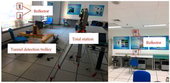 After the hardware system is integrated, the time and space of the system must be synchronized [20]. Considering that data transmission will lead to inaccuracies in the time, the timing of the multi-sensors is unified to the timing of the central control computer system, which interpolates the data obtained by the odometers and displacement sensor based on the number of cross-sections that are received by computer in the unit time. Then, the time synchronization of the scanner, odometers and displacement sensor is realized. The main purpose of space synchronization is to establish the spatial correspondence of the scanner coordinate system, trolley body coordinate system and track coordinate system, which involves the obtaining of the calibration parameters of the monitoring system. The calibration process has to be carried out on the track which geometric parameters have already been obtained. First, the spatial relationship between the trolley body coordinate system and scanner coordinate system is established by using the total station coordinate system as the transition coordinate system. Then, the transformation relationship between the scanner coordinate system and the track coordinate system is obtained by combining the posture of the trolley body and the attitude of the track. The initial calibration experiment can be carried out in a laboratory environment, which is shown in Figure 2. Repeated disassembly and assembly of the equipment may lead to tiny changes of the equipment calibration parameters; however, because the trolley body is a rigid structure, and the relative position of the trolley body and track can be approximated as invariable. Therefore, the onsite calibration can be completed by confirming the relationship between the scanner and the trolley body.