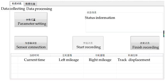 To control the multi-sensors of the system to collect data and fuse the multi-source data, the data acquisition software is developed on the platform of Visual Studio 2010 C++ (Microsoft, Redmond WA, USA). The software consists of two modules, which are data collecting and data processing; its main interface is shown in Figure 3. The data collecting module controls the data acquisition process of the tunnel monitoring trolley by setting relevant parameters of each sensor, such as the serial ports, current mileage, IP address, storage path and file name. After the parameter setting is completed, each sensor is established a connection and the tunnel monitoring trolley can be carried out from the mileage of the starting point to the mileage of the end point. Finally, the data collected by each sensor are automatically recorded in their corresponding pre-set folder in the software. Furthermore, to ensure that the error in the later data fusion process is small enough, the uniform walking speed should be ensured in the process of data acquisition. The experiment shows that according to a normal human walking speed, a 1–2 cm interval of adjacent cross-sections can be achieved in the direction of the tunnel, and the density of cross-sectional points in every section can reach 2–3 mm.