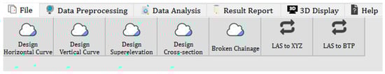 Because of the large amount of point cloud data and because the time available for data acquisition in the tunnel is very limited, the analysis of the cross-section cannot be completed in real time. Therefore, in this paper, the tunnel data processing software is specially developed based on the QT platform. The basic processing of point cloud data (including denoising, scanning line generation, tunnel extraction, track extraction, and central axis generation, etc.) can be completed with the software. Concurrently, the cross-sections of arbitrary mileages or arbitrary mileage intervals can be selected for analysis, and the analysis results can be exported in the form of reports. In addition, the three-dimensional modelling and display of tunnel can be completed using the software, and the main interface of the data processing software is shown in Figure 4.